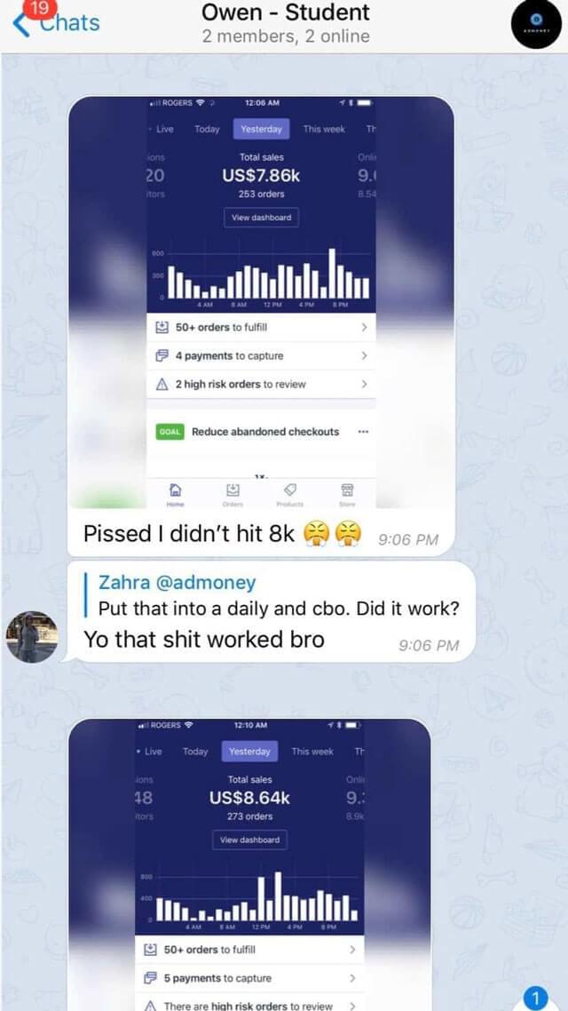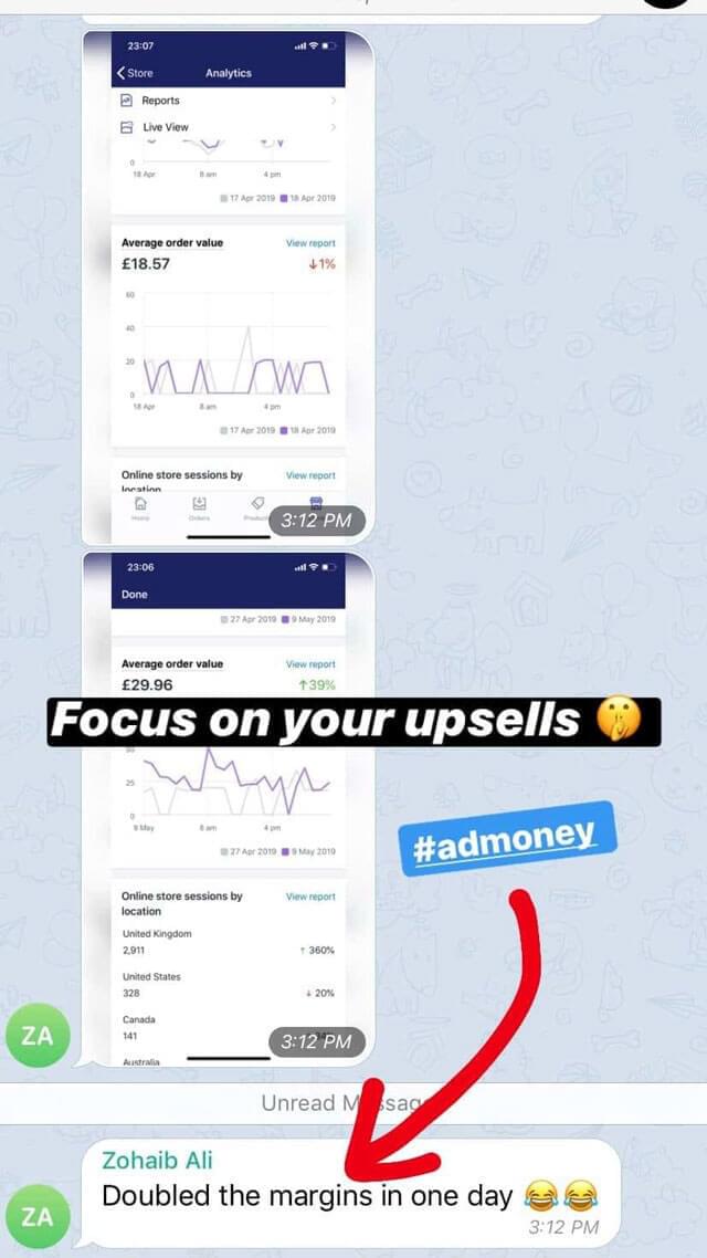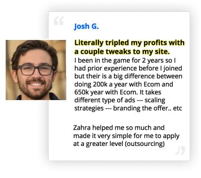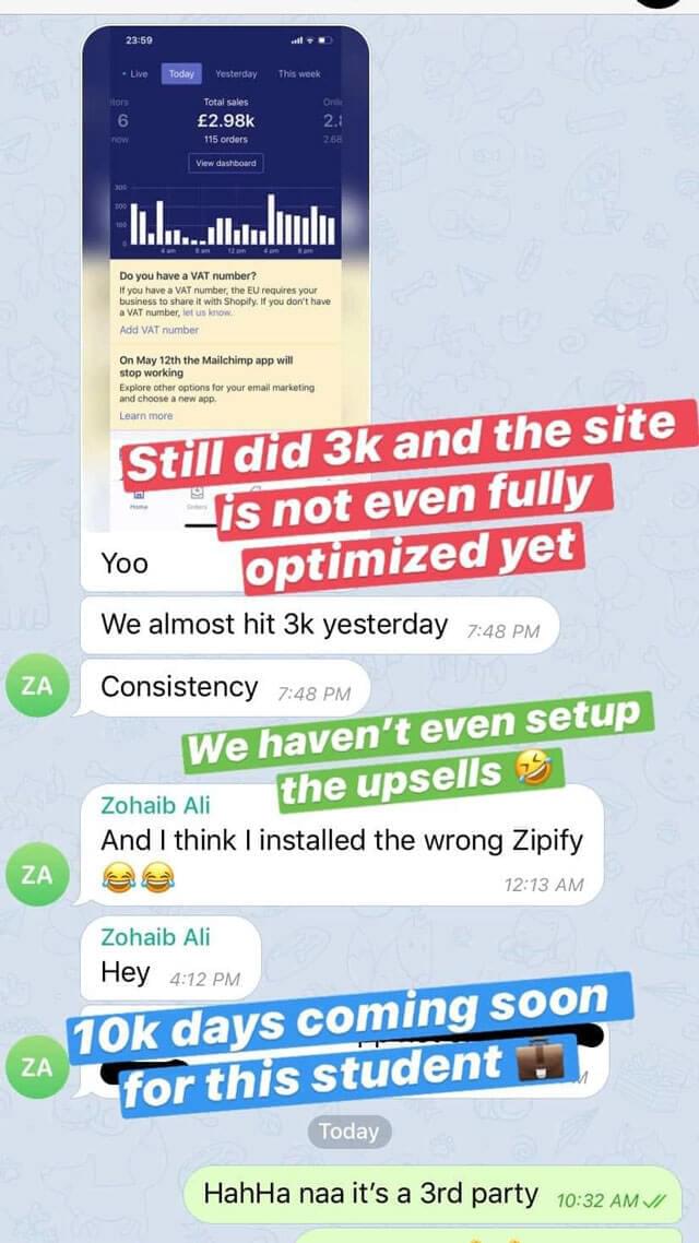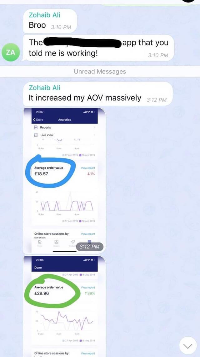 Zohaib - Was struggling with AOV before he joined. We increased cart value by $10 overnight once he understood the types of upsells to offer for his niche.