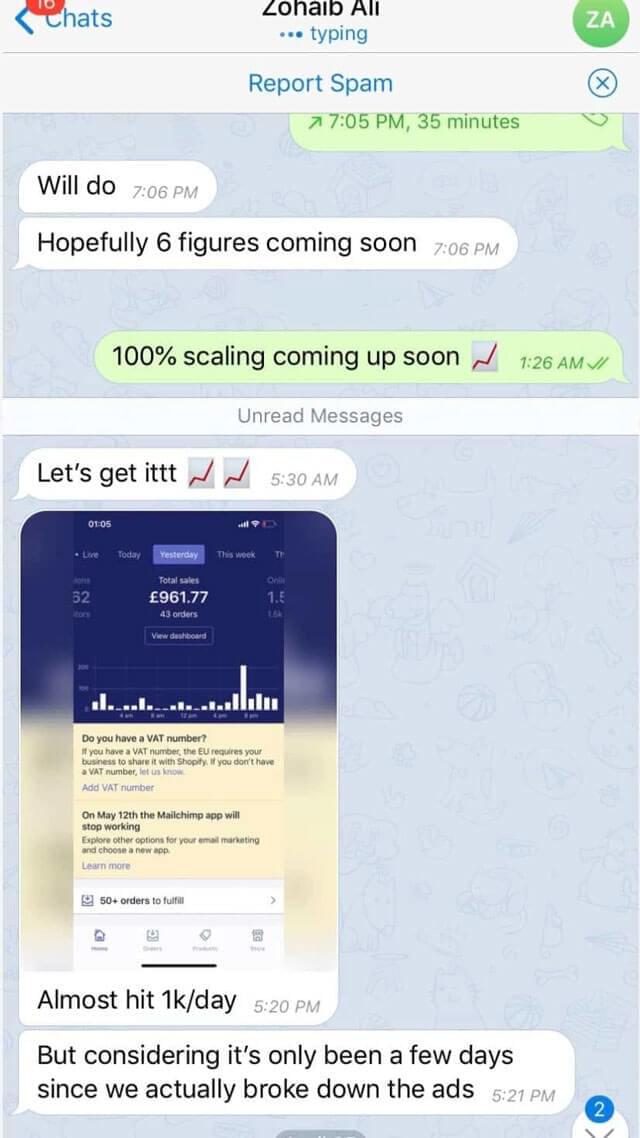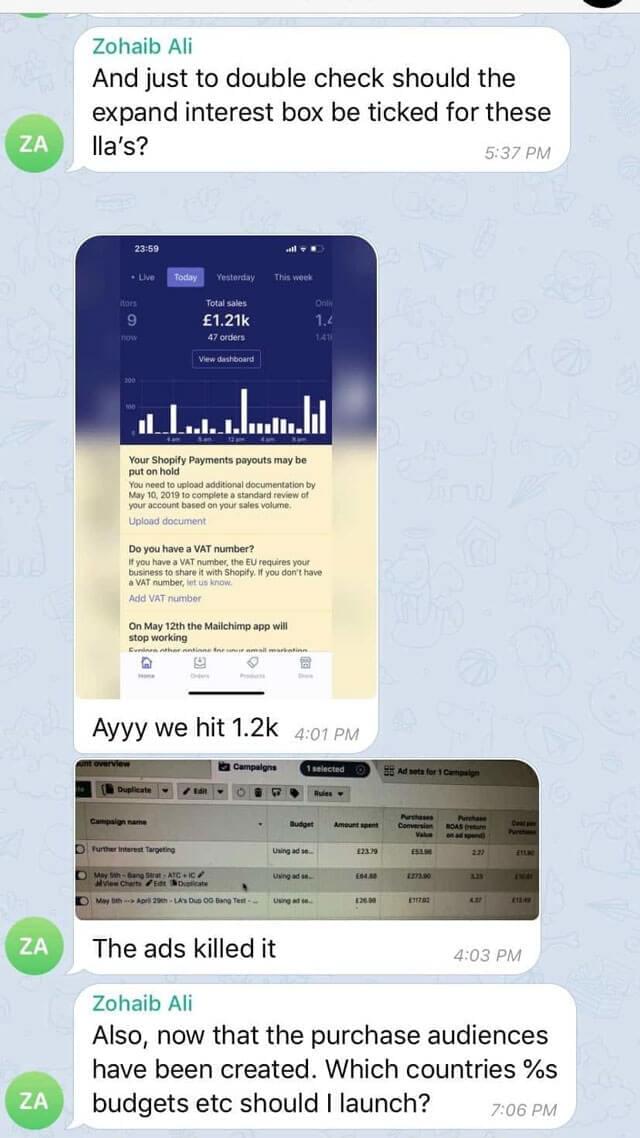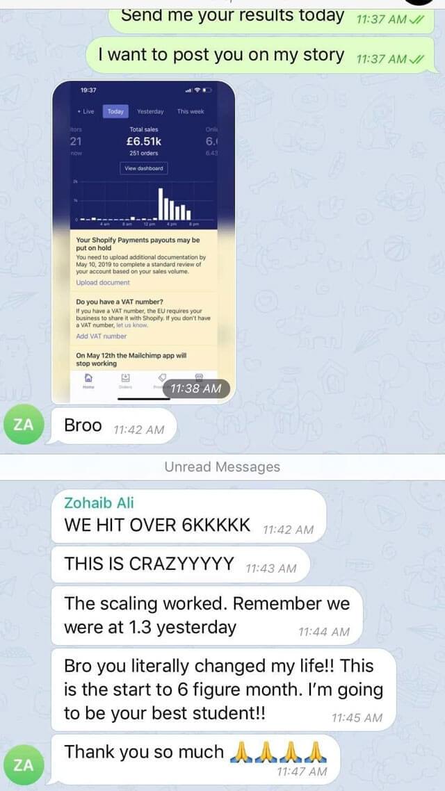 Zohaib - "You literally changed my life" We scaled hard today. Went from $1.3k to $6.5k in ONE day! We will be adding another