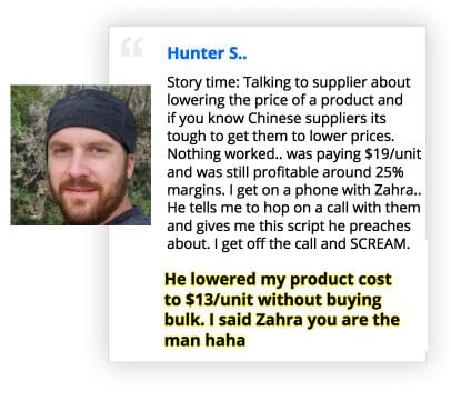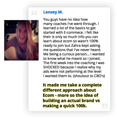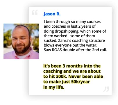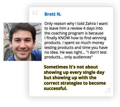 Brady - "Didn't know a thing coming into Ecom when I met Zahra. He changed my life completely from working at a bar. Asked him for round 2 of coaching so we can scale my store to a 500k/month."