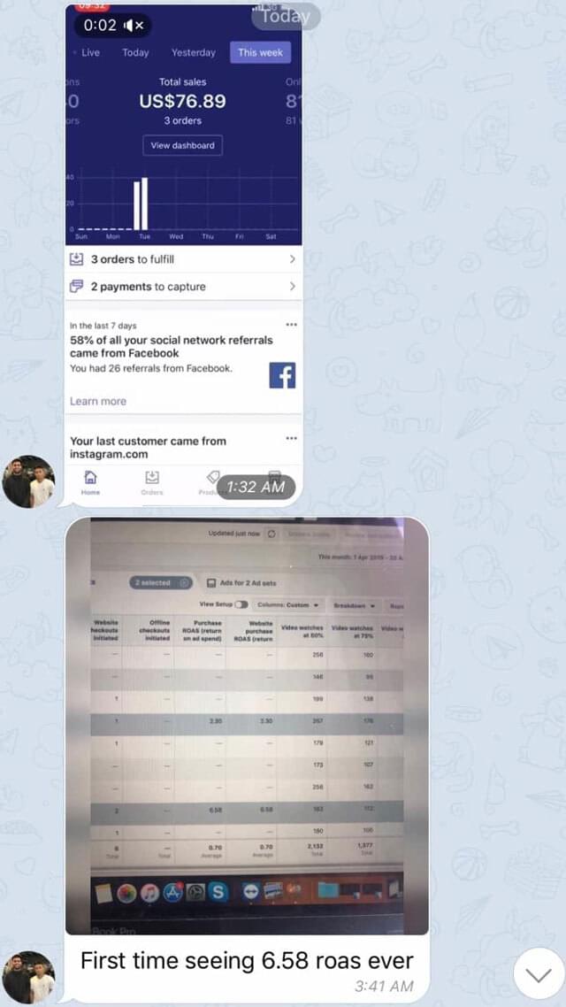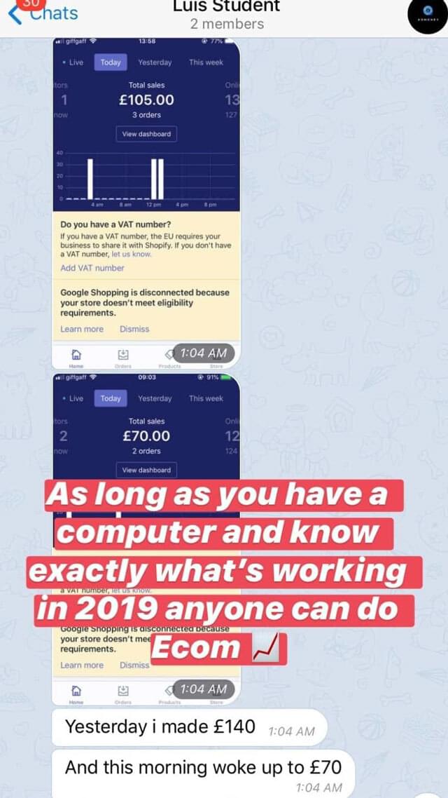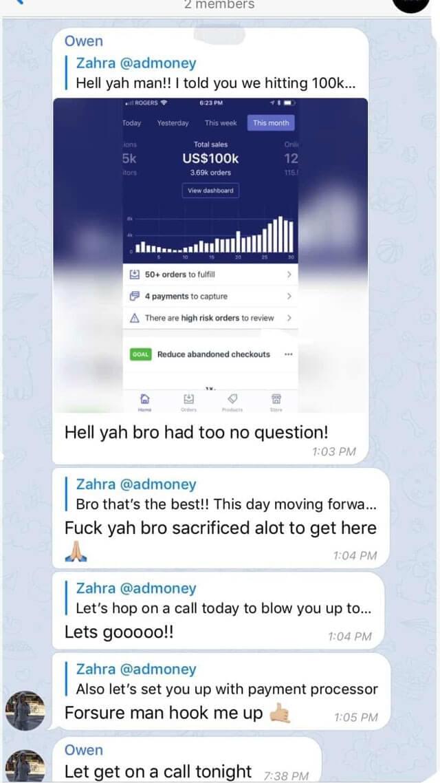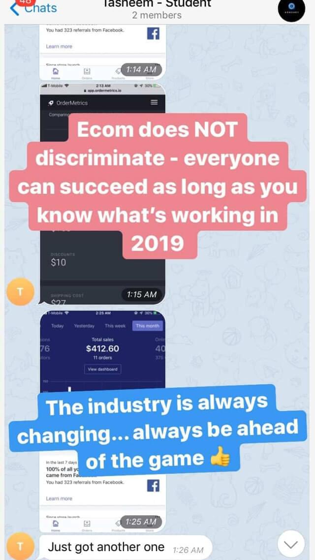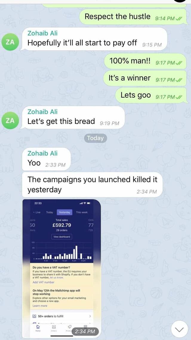 Dylan - "Launched my 1st ecom store with Zahra and got sales on the 3rd day in which I was super excited as I never got a sale before. Before I met him I launched my stores 2 other times and lost $300 with no sales. It was a great feeling after-all."