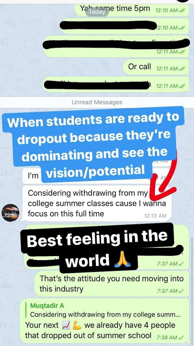 Muquadir - Dropped out after his first month into the program. Realized school was taking too much time while running a 30k/month business.